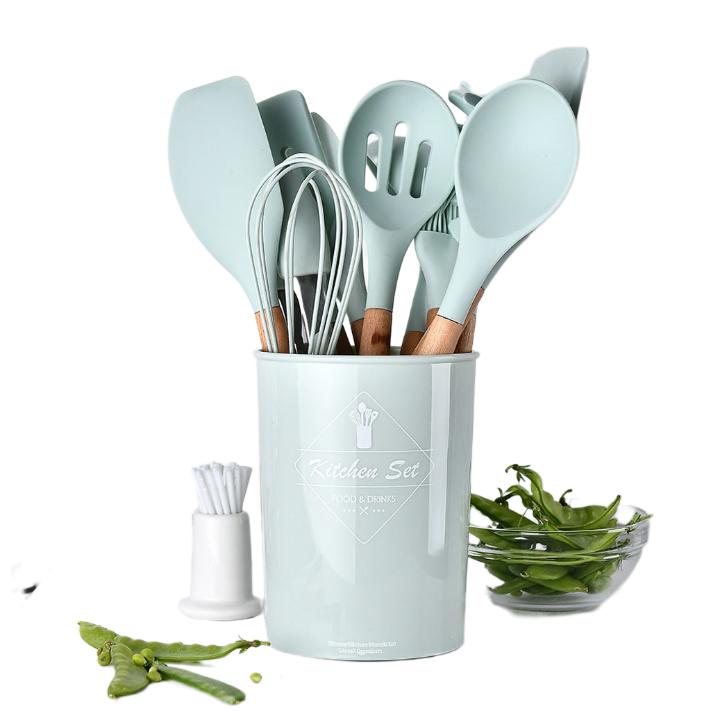 Premium 11-teiliges Küchenhelfer Set aus hochwertigem Silikon mit eleganten Holzgriffen.